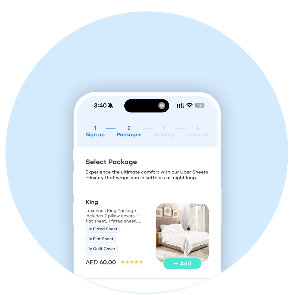 You choose a package through our app based on your bed size, how often you want fresh linens (weekly, bi-weekly, or monthly), and any extras like towels or extra pillowcases. We deliver your clean set and pick up the used ones. For 30 AED, we’ll even make the bed for you.